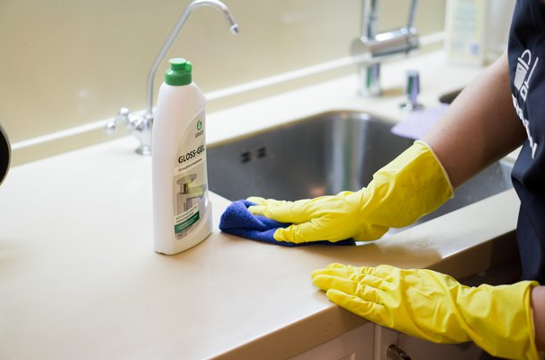 -Очистите шкафы и столешницы: Выньте все содержимое шкафов и протрите полки и ящики влажной тряпкой с мягким моющим средством. Протрите столешницы влажной тряпкой с универсальным очистителем.